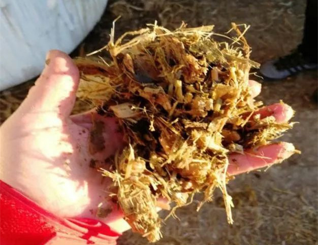 優質的(de)全株玉米(mi)青貯(zhu)飼料氣(qi)味(wei)酸(suan)香、柔(rou)和(he),不刺鼻(bi),給人(ren)以舒(shu)適感;若(ruo)有(you)刺鼻(bi)的(de)酸(suan)味(wei)或酒(jiu)味(wei),則說明(ming)(ming)發(fa)酵產(chan)生乙(yi)酸(suan)和(he)乙(yi)醇較多,品質較次;若(ruo)有(you)令人(ren)惡心的(de)氣(qi)味(wei),則說明(ming)(ming)發(fa)酵過(guo)程產(chan)生過(guo)多丁酸(suan),若(ruo)出現(xian)霉味(wei),則說明(ming)(ming)壓實不嚴(yan),空氣(qi)進入(ru)引起(qi)霉;若(ruo)腐(fu)爛,腐(fu)敗(bai)或發(fa)臭,則為劣等,不宜飼喂家畜。