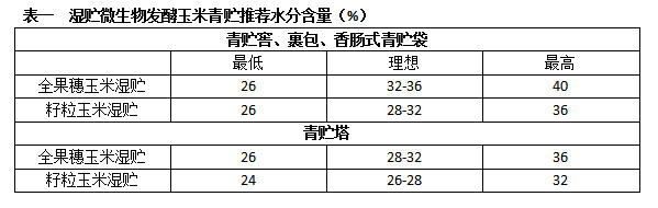 濕貯微生物發酵玉米貯存方式有青貯塔、青貯窖、香腸式青貯袋、裹包等,貯存方式不同,收獲時水分含量選擇不同。貯存濕度超過40%時,發酵過程中酵母等有害微生物發酵風險較高,可能增加乙醇含量,適口性下降。若籽粒太干,則會降低產量,且難以加工,導致發酵緩慢。水分含量推薦如下表: