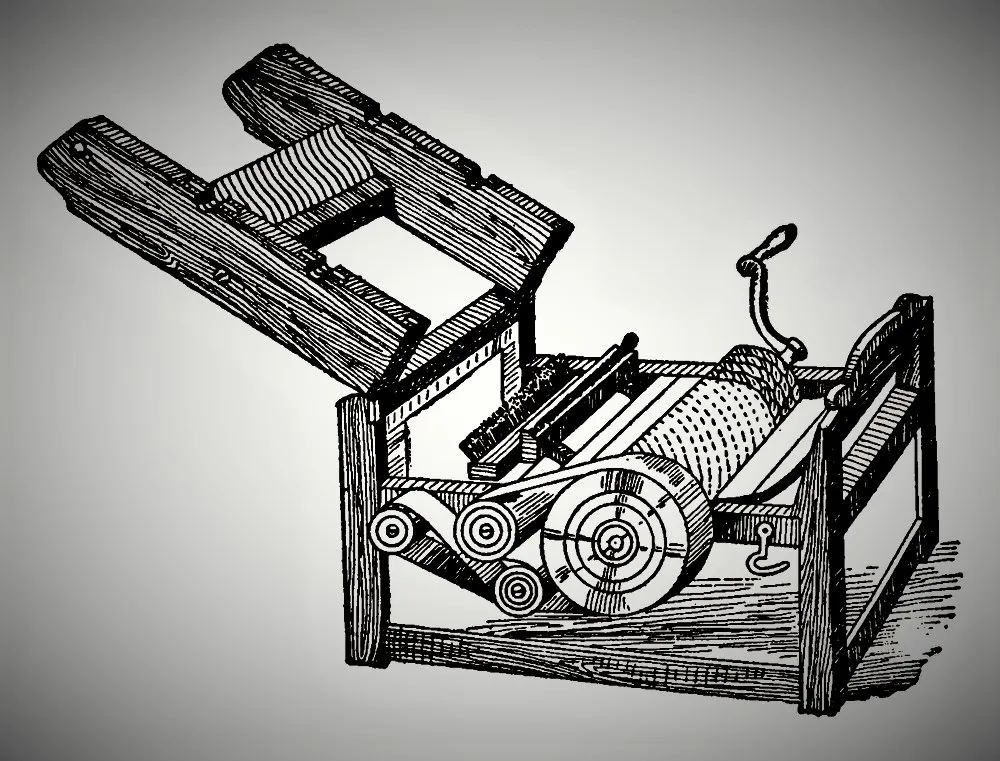 直到18世紀末,小有成就的美國發明家埃利·惠特尼應棉花商人的邀約,發明一款剝棉籽的機器。惠特尼設計出一個帶有鋼齒的圓筒,轉動圓筒,鋼齒就可以把棉絨(棉籽表皮上剝下來的短纖維)撕扯下來,并用離心力濾掉棉籽。