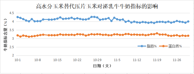 2、高水分玉米替代壓片玉米乳脂肪降低0.22百分點,乳蛋白基本(ben)無變化。