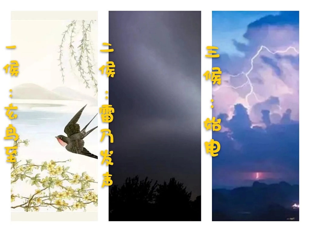 一候:玄鳥至玄鳥,又稱元鳥,即燕子。燕子是春分來,秋分去的候鳥。